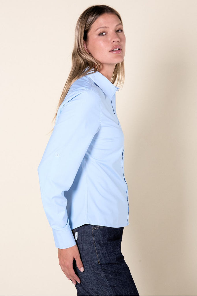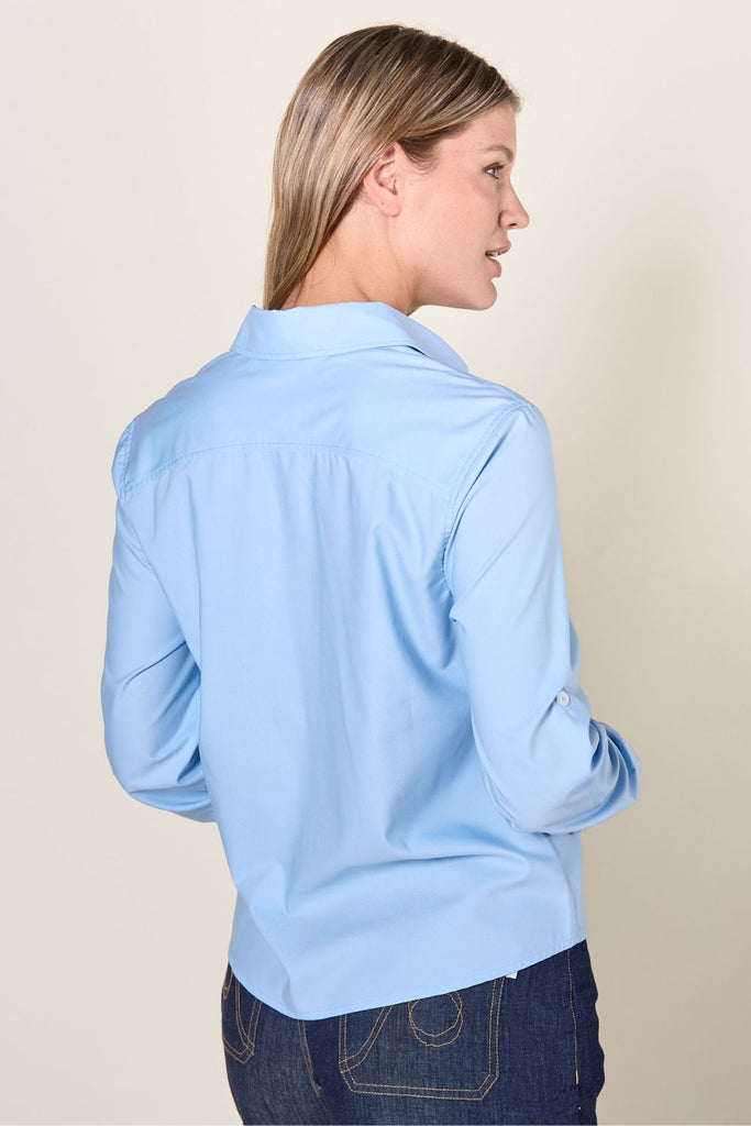 For optimal sun protection for your neck and nape, its collar can be raised and held in place thanks to an ingenious little magnet. The sleeves are designed so that they can be rolled up and rolled up elegantly. It also has a pocket at chest level.